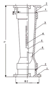 1.法蘭 2. “0”密封圈 3. 錐管 4. 刻度尺 5.導桿 6.浮子 |