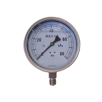 膜盒耐震壓力表由測量系統(包括接頭,波紋膜盒等),傳動機構(包括拔桿機構,齒輪傳動機構),指示部件(包括指針與度盤)和外殼(包括表殼、襯圈和表玻璃)所組成。當被測介質的壓力作用于膜盒時,其自由端產生相應彈性變形一位移,經撥桿帶動傳動機構放大,由指示裝置將被測壓力在儀表盤上指示出來,且表內充油,達到耐震的效果。